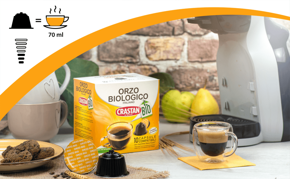 L’Orzo Biologico Italiano Crastan in capsule compatibili Dolce Gusto®* è un’ottima alternativa al caffè perché naturalmente priva di caffeina. Priva anche di zuccheri può essere gustata in qualsiasi momento della giornata.